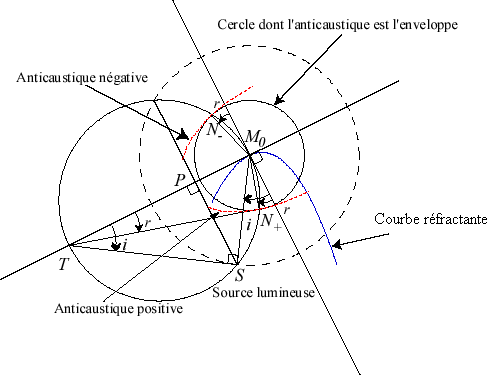 L'anticaustique positive est la partie située du côté de S par rapport à (D), et l'anticaustique négative, l'autre partie. |