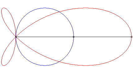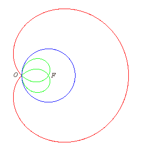 Lorsque F est au centre du cercle, la strophoïdale est la néphroïde de Freeth. Lorsque F va à l'infini, la strophoïdale tend vers une torpille (voir ci-dessous). |