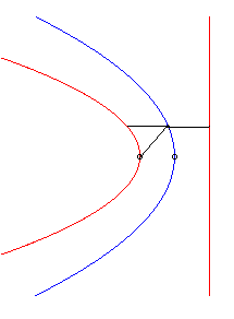 | Lorsque la courbe de départ est une parabole de foyer O et de paramètre p, la direction de droite l'axe de la parabole, l'une des branches de la strophoïdale n'est autre que la directrice, et l'autre, une parabole de sommet O et de paramètre p/2. |