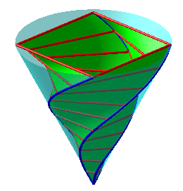 | Relèvements coniques de spirales d'Archimède à gauche, logarithmiques à droite. | ![]() |