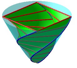 | Relèvements sur paraboloïde hyperbolique de spirales d'Archimède à gauche, logarithmiques à droite. | ![]() |